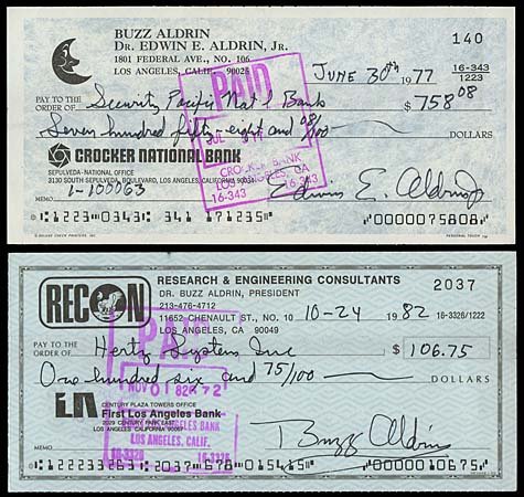 Two signed checks: one check dated 1977 signed by Edwin E. Aldrin, Jr; other dated 1982 signed Buzz Aldrin. Both checks have logos related to the Moon. Very fine & highly desirable.