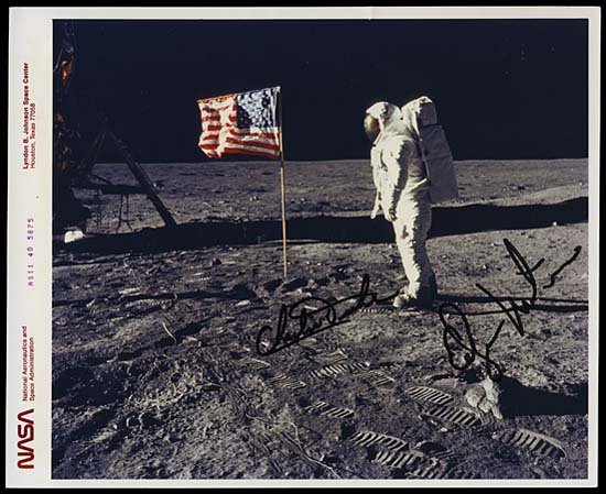 Apollo astronauts and moonwalkers Edgar Mitchell (Apollo 14) and Charlie Duke (Apollo 16) Signed NASA Litho. Both signatures are clear and bold in black sharpie marker pen.